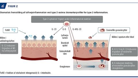 Den biologiske astmabehandling med IL-5-receptorantagonisterne mepolizumab, benralizumab og reslizumab reducerer eosinofiltallet i blodet, som er stærkt påvirket af IL-5, men påvirker ikke FeNO-værdien. Derimod nedsætter behandling med dupilumab FeNO-værdien igennem sin reduktion af IL-13-aktivitet [2]. På baggrund af disse observationer har man foreslået, at patienter med svær type 2-astma også bør opfattes som en heterogen gruppe, hvor nogle primært har IL-5-drevet inflammation, nogle primært har IL-13- og IL-4-drevet inflammation, og nogle har begge dele (Figur 2).