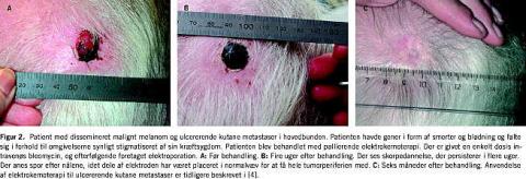 Til lokal behandling af generende kutane og subkutane tumorer kan elektrokemoterapi være et behandlingsalternativ (Figur 2 ). Man udnytter her, at man i et lokalt område, der er begrænset af elektrodernes placering, kan øge kemoterapiens cytotoksiske virkning flere hundrede gange. Da øgningen i cytotoksicitet er så udtalt, virker behandlingen også ved kræftsygdomme, der under normale omstændigheder ikke responderer på kemoterapi, og hos patienter, hvor man har afstået fra yderligere kemoterapi som følge af behandlingssvigt. Elektrokemoterapi kan også anvendes i områder, hvor der tidligere er givet strålebehandling.