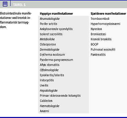 Summary Extraintestinal manifestations in inflammatory bowel disease Ugeskr Læger 2009;171(43):3078-3083 Extraintestinal manifestations are relatively common in chronic inflammatory bowel disease and affect joints, skin, eyes and bile ducts. The most frequent rheumatologic manifestations are peripheral arthritis and axial arthropathies. Erythema nodosum and pyoderma gangraenosum are common dermatological manifestations, while episcleritis, iridocyclitis and uveitis are common ophthalmological complications. Conventional drugs and biologicals have proven effective in the treatment of several of the manifestations, including peripheral arthritis, pyoderma gangraenosum and episcleritis.