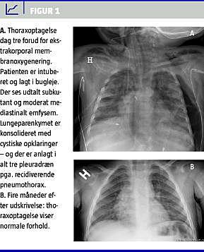 En tretten måneder gammel dreng blev indbragt til et lokalt sygehus, umiddelbart efter at han under et besøg hos familie havde drukket af en olielampe. Han var fra starten klinisk påvirket med stødende vejrtrækning og dårlig iltmætning. Han blev lagt i nasal continuous positive airway pressure (CPAP), men respirationen blev tiltagende påvirket, og der tilkom bevidsthedssløring. Saturationen var ca. 80% med 100% ilt på maske. Syre-base-status viste metabolisk acidose, pH var 7,27, p a CO 2 var 5,3 kPa, base excess var −8,4 og laktat var 2,2 mmol/l. Drengen blev intuberet og overført til en intensivafdeling. Resultaterne af en røntgenundersøgelse af thorax var forenelige med svær bilateral kemisk pneumoni. På formodning om yderligere forværring af tilstanden blev han overflyttet til et universitetshospital. Han kunne initialt stabiliseres med konventionel respiratorbehandling, men fik bilateral pneumothorax og subkutant emfysem ( Figur 1 A) samt tiltagende problemer med iltning og stigende CO 2 trods inhalation med epoprostenol og lejring i bugleje. Der blev anlagt velfungerende pleuradræn. Ud over lungeproblemer og tegn på et aktiveret koagulationssystem (forhøjet D-dimer) var der ikke betydende påvirkning af andre organsystemer. Røntgenforandringerne progredierede med store cystiske opklaringer i lungeparenkymet på begge sider. Den fortsatte progression gav anledning til kortvarig behandling med højfrekvent oscillation i respirator og nitrogenoxid, men uden tilstrækkelig stabiliserende effekt. På grund af fortsat forværring af tilstanden og truende kredsløbspåvirkning blev behandlingen knap tre døgn efter debut ændret til venoarteriel ECMO. Påbegyndelse og forløb af ECMO var ukompliceret, og ECMO-behandlingen kunne afvikles efter ni døgn. Drengen fik derefter konventionel respiratorbehandling i to døgn, før han kunne ekstuberes, og yderligere tre døgn senere blev han overflyttet til stamhospitalet. Ved en kontrolundersøgelse fire måneder efter ulykken var han klinisk upåvirket, og et røntgenbillede af thorax viste normale forhold (Figur 1B).