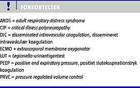 Legionellabakterier kan forårsage svær interstitiel pneumoni med systemisk påvirkning. Målrettet antibiotisk behandling og hurtig diagnosticering kan reducere risikoen for komplikationer som multiorgansvigt og fulminant respiratorisk svigt. Respiratorbehandling kan være nødvendig i svære tilfælde, og den derved tryk- og volumeninducerede lungeskade og øgede mortalitet forsøges formindsket med moderne respiratorterapi [1]. I dette kritiske stadie med vedvarende hypoksi er andre behandlingstiltag ind i mellem nødvendige. Extracorporal membrane oxygenator (ECMO) er en venovenøs bypass, hvor blodet oxygeneres ekstrakorporalt, og metoden kan være et alternativ til konventionel behandling, indtil den udløsende infektiøse årsag til adult respiratory distress syndrome (ARDS) er under kontrol.