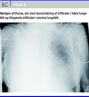 ARDS er kendetegnet ved kombinationen af nytilkomne bilaterale infiltrater i lungerne (se Figur 1 ), hvor forholdet mellem ilttensionen i arterieblodet og i inspirationsluften er mindre end 200 mm Hg. Kardiogent udløst lungeødem bør udelukkes som differentialdiagnose [1]. Den isolerede mortalitet for ARDS er fra 25 til 58% [2]. Behandlingen kan inddeles i en farmakologisk og nonfarmaologisk del. Der tilstræbes lav tidalvolumen, trykstøtte og lav til moderat højt positivt sluteksspirationstryk (PEEP) for at formindske risikoen for respiratorinducerede lungeskader (volo- og barotraume, biokemisk traume) [1, 2]. Inhalation af nitrogenoxid, bugleje og neuromuskelblokerende midler kan have en midleridig gunstig effekt. Men effekten af epoprostenol er dog tvivlsom, idet der kun findes kasuistiske meddelelser, dyrestudier og retrospektive studier, som ikke er entydige [2].