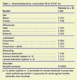 I perioden 2001-2006 blev ni patienter udredt og strålebehandlet for primært MALT-lymfom øjets adnexa på Rigshospitalet (RH) (se Tabel 1 og Tabel 2 ). Alle patienter var henvist af øjenlæger og privatpraktiserende læger fra Østdanmark. Alle patienter fik taget tumorbiopsi til histopatologisk og immunhistokemisk undersøgelse mhp. klassifikation iht. WHO's kriterier. De blev stadiegennemgået i henhold til vanlige retningslinier med objektiv undersøgelse, blodprøver, computertomografi af thorax og abdomen samt knoglemarvsundersøgelse. Biopsierne blev evalueret af en hæmatopatolog (professor El isabeth Ralfkiær ). Samtlige patienter havde udelukkende lokaliseret sygdom. Behandlingen bestod i første omgang af RT med en totaldosis på 26 Gy (i 13 fraktioner med fem fraktioner pr. uge). Ved de anteriore strålebehandlinger blev der i de tilfælde, hvor det var muligt, afhængigt af tumors beliggenhed, benyttet beskyttelse med blycylinder over cornea for at forebygge udviklingen af katarakt. En enkelt patient recidiverede efter 26 mdr. og behandledes med rituximab.