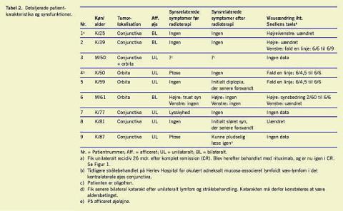 Materiale og metoder: Retrospektiv gennemgang af journalerne for ni patienter, som blev strålebehandlet på Rigshospitalet i perioden 2001-2006 for MALT-lymfom i øjets adnexa. Synsfunktionen blev undersøgt før og efter strålebehandling hos seks ud af de ni patienter.