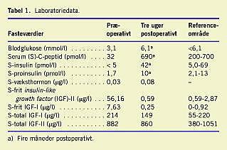 Serumkoncentrationerne af insulin, C-peptid og proinsulin var supprimerede (Tabel 1 ). De totale (frit plus bundet) serumkoncentrationer af IGF-I og IGF-II lå inden for referenceområderne, mens de frie serumkoncentrationer af IGF-I og IGF-II var forhøjede, og især frit IGF-II var kraftigt forhøjet. Koncentrationen af væksthormon var lav. Ved en computer-tomografi (CT) sås en stor tumor i venstre leverlap. Der blev ikke fundet tegn på dissemineret sygdom. Histologien baseret på en grovnålsbiopsi viste en benign mesenkymal tumor af leiomyomatøs type.