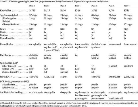 I alt syv patienter udviklede ekstrapulmonale komplikationer til M. pneumoniae-infektion. Komplikationerne fordelte sig således: encephalitis (3), hæmolytisk anæmi (2), polyradiculitis (1) og transversel myelitis (1). Af disse syv patienter udviklede tre tillige erythema multiforme og en udviklede kardiale komplikationer i form af arytmier. I Tabel 3 er de kliniske og de biokemiske data for de syv patienter beskrevet. To typiske forløb er tillige illustreret ved gennemgang af patient nr. 1's og patient nr. 4's sygehistorier.