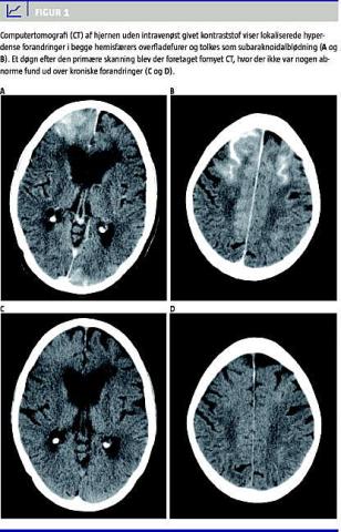 Under og efter proceduren fik patienten motorisk uro, konfusion og nedsat kraft af venstre overekstremitet og forhøjet blodtryk på 210/110 mmHg. Fire timer efter proceduren blev der på mistanke om intracerebral blødning udført akut computertomografi (CT) af cerebrum (CTC) uden brug af intravenøst (i.v.) givet kontraststof (Figur 1 ). Skanningen viste lokaliserede hyperdense forandringer i hjernens overfladefurer i begge hemisfærer samt universelt ødem og blev derfor tolket som en stor SAH. På trods af at det var tale om en tom skanning, var der tydelig kontrastopladning i hjernens kar, hvilket dog ikke blev identificeret primært. Acetylsalicylsyre og clopidogrel blev pauseret, og patienten blev observeret tæt. Inden for samme døgn aftog symptomerne, og der blev udført fornyet CTC uden i.v. kontrast 26 timer efter KAG/PCI. Denne skanning viste ingen tegn på SAH, ødem eller iskæmi, og der blev ikke fundet noget abnormt ud over kroniske forandringer i form af atrofi og leukoariose. Patienten blev udskrevet to døgn senere i habituel tilstand.