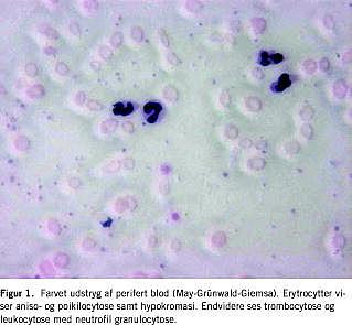 En 52-årig kvinde blev indlagt akut med diagnosen anæmi. Før indlæggelsen havde hun haft opkastninger og diaré i ti dage. Menopausen var nået 6 mdr. forud. Ved ankomst til hospitalet var hun voksbleg og somnolent. Blodtrykket var 83/22 mmHg, pulsen 85, iltmætningen 100% (ABL), og et elektrokardiogram viste ikke iskæmi. Patienten vejede 54 kg. Der var melæna, men intet frisk blod i ventriklen. På en røntgenoptagelse sås infiltrat foreneligt med pneumoni, en lumbalpunktur afkræftede meningitis. Biokemisk sås udtalt jernmangelanæmi med Hb 1,1 mmol/l og delvist kompenseret metabolisk acidose (pH 7,25, PaO2 15,5 kPa, PaCO2 3,5 kPa, BE -14,7). Der var trombocytose og leukocytose, men normalt C-reaktivt protein. Serum-kreatinin, carbamid, urat, alanin-aminotransferase, aspartat-aminotransferase, laktatdehydrogenase og kreatin-kinase var øget, og koagulationsfaktor 2, 7 og 10 var nedsat. Blodudstrygning viste aniso- og poikilocytose samt hypokromasi, men var uden tegn på malignitet (Figur 1 ). Tilstanden tolkedes som universel hypoksi udløst af ekstrem jernmangelanæmi og monitoreredes løbende (Tabel 1 ).