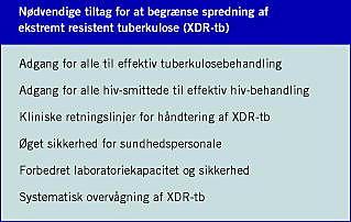 Epidemier, der enten rammer pludseligt og uventet, eller som rammer sundhedspersonale i den vestlige verden, er godt pressestof. I 2003 prægede sygdommen svært, akut, respiratorisk syndrom (SARS) forsiderne verden over, men trods stor bekymring endte SARS dog hurtigt som et kuriosum. Verdenssamfundet kan se tilbage med stolthed på en epidemi, der blev kvalt i sin vorden af et effektivt internationalt samarbejde. Overskriften i 2006 er langt mere dyster: vi står nu over for en epidemi med en af verdens ældst kendte fjender, tuberkulosebakterien (tb), som er blevet resistent over for stort set alle kendte og effektive antibiotika; XDR-tb (= extended eller extreme drug resistent mycobacterium tuberculosis).