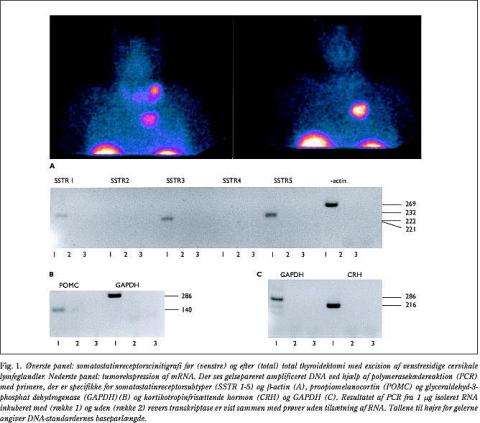 Patienten fik foretaget total tyroidektomi. Mikroskopien viste thyroideavæv, der var infiltreret af MTC-celler med immunopositivitet for kalcitonin og CRH, men ikke for ACTH. En analyse af DNA i perifert blod viste ingen mutationer i rearranged during transfection (RET)-proto-onkogenet. En ny SRS viste uændret opladning i den mediastinale proces (Fig. 1). Ved en efterfølgende resektion af den mediastinale proces viste immunhistokemien på ny positivitet for kalcitonin og CRH, men ikke for ACTH. En analyse af den mediastinale tumor viste mRNA-transkripter for somatostatinreceptorsubtyperne 1, 3 og 5, men ikke for 2 og 4 (Fig. 1). Tillige indeholdt vævet mRNA for såvel POMC som CRH (Fig. 1).