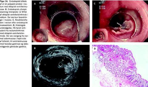 En 19-årig mand blev henvist til Kirurgisk Gastroenterologisk Afdeling, Amtssygehuset i Gentofte, på grund af gentagne tilfælde af frisk blødning per rectum. Ved en sigmoideoskopi blev der fundet et 1 cm stort, let eleveret polypøst inflammeret område umiddelbart lateralt i rectum 1-2 cm fra linea dentata (Figur 1A ). Ved en endoskopisk ultralydskanning med miniprobe (12 MHz) kunne der påvises fortykkelse af de to øverste lag af mucosa. Der sås ingen dybereliggende forandringer (Figur 1B ). En biopsi viste ventrikelslimhinde af corpustype med et veldifferentieret cylindrisk overfladeepitel og korte foveolae. Ved en efterfølgende parietalcelleskintigrafi påvistes der ingen ektopisk slimhinde andre steder i GI-kanalen. I universel anæstesi blev der udført endoskopisk mukos-ektomi (Figur 1C ).