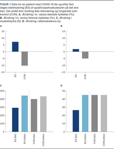 Efter samtykke og inklusion fik han foretaget indledende undersøgelse (præ) af muskelstørrelse (muskeltykkelse af m. rectus femoris (RF) og m. vastus lateralis (VL) målt med UL-skanning), quadricepsmuskelstyrke (med Lafayette dynamometer) og et-bens balancetest. Herefter fik han påført den specialiserede NMES-TED-strømpe på et randomiseret ben (ES) og en normal TED-strømpe på det andet ben (CON). Ud over vanlig fysioterapi modtog patienten herefter NMES tre gange dagligt i fem dage. NMES-protokollen bestod af en kortvarig opvarmning (10 Hz 300 μs i tre minutter) efterfulgt af 30 minutters stimulering (60 Hz 400 μs), ved patientens subjektive tolerancetærskel og intensiteten (mA) blev noteret. Han oplevede intet ubehag ved NMES. Umiddelbart før udskrivelsen blev alle undersøgelser og målinger gentaget (post), resultaterne er opsummeret i Figur 1. På det ben, der fik elektrisk stimulering, sås en let øgning/bevaret tykkelse af VL (+ 7,4%) og RF (+ 2,0%), hvorimod der sås et fald på henholdsvis –10,5% (VL) og –5,4% (RF) på kontrolbenet (Figur 1A + B). Der sås en fremgang i muskelstyrken bilateralt, men størst fremgang på det stimulerede ben (ES: + 145 N, CON: + 32 N (Figur 1C)). På det stimulerede ben sås også en fremgang i et-bens balancen (ES: + 18,5 s), mens balancen på kontrolbenet var uændret (Figur 1D).