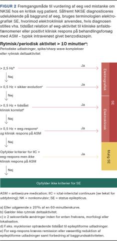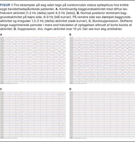 Patienter med akut hjerneskade er i stor risiko for at udvikle epileptiske anfald, som kan være både konvulsive og nonkonvulsive. Såfremt anfaldene ikke ophører spontant eller brydes med antiepileptisk medicin, udvikles status epilepticus. Nonkonvulsiv status epilepticus (NKSE) defineres som længerevarende (over 10 min) ændring af bevidsthedsniveau, adfærd, autonom funktion eller sensorium i relation til kontinuerlig epileptiform aktivitet i eeg uden prominente motoriske (konvulsive) symptomer [1]. NKSE udgør mere end 90% af anfald hos bevidstløse patienter på en intensivafdeling og kan ses ved alle tilstande, som forstyrrer hjernens funktion inkl. anoksisk eller traumatisk hjerneskade, stroke, neuroinfektion og encefalopati ved medicinsk sygdom [2].