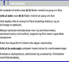 Årligt henvender 55.000 personer over 65 år sig til skadestuen, og 41.000 af disse henvendelser er relateret til fald. Fald skyldes ofte et samspil af flere forskellige faktorer, og en af mange er synkoper. Hyppigheden af synkoper stiger med alderen og er formentlig undervurderet [1]. Formålet med oprettelse af faldklinikkerne er at udrede og forebygge de mange fald. En del fald skyldes forstyrrelser i hjerterytmen, som ikke umiddelbart lader sig afsløre ved et konventionelt elektrokardiogram, der kun registrerer ganske få sekunder. Hjerterytmeforstyrrelser kommer ofte uvarslet og kan forekomme med dages til ugers interval, men de er ikke desto mindre alvorlige, og de er vanskelige at detektere og følgelig også at behandle. Mange hjerterytmeforstyrrelser viser sig som besvimelser eller nærbesvimelser, svimmelhed, svaghed og andre uspecifikke symptomer [2]. Anvendelse af R-testen - event-recorderen - i forbindelse med udredningen af fald har allerede nu vist sig at kunne reducere indlæggelsestiden og dermed udgifterne til sundhedsvæsenet [3]. Undersøgelsen af hjerterytmen kan foregå såvel ambulant som under indlæggelse, og undersøgelsen har vist sig anvendelig både til at diagnosticere hyppige såvel som sjældnere arytmier samt i forbindelse med regulering af en allerede kendt atrieflimren [2, 3].
