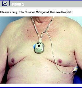 R-testen gennemføres ved hjælp af en lille computer på 7,0 × 5,5 cm, dvs. på størrelse med en æske tændstikker, med to 1,4 volts knapcellebatterier. Computeren vejer 40 gram. R-test-computeren monteres med to hjerteelektroder svarende til en V5-afledning, således at en elektrode påklæbes over den nederste del af brystbenet, og en anden elektrode påklæbes under venstre arm på højde med femte ribben. Desuden er der monteret en ledning øverst på R-testen, og denne har patienten rundt om halsen, således at R-testen fremstår som et halssmykke (Figur 1 ). Midt på forsiden af R-testen er der en sort knap, som patienten selv kan aktivere, hvis han eller hun føler et af de symptomer, der førte til hjerterytmeundersøgelsen. Når resultatet efterfølgende aflæses, vil episoden være markeret, og den kan herefter vurderes. R-testen er på forhånd indstillet til at registre et vist antal arytmier af en bestemt type, typisk bradykardiepisoder, takykardi, pauser, ekstrasystoler mv. Der er kapacitet til ca. 20 minutters optagelse. R-testen er ydermere indstillet til at starte optagelsen et vist antal sekunder før og efter, en arytmi forekommer. Desuden registrer en kontinuerlig trendkurve pulsen for hele den periode, i hvilken patienten har R-testen på. Normalt bærer patienten R-testen i en uge (5-7 dage), og der er batterikapacitet til mindst otte dage afhængigt af antallet af arytmier. R-testen kan let tages af og sættes på igen, når patienten skal i bad, og elektroderne kan uproblematisk skiftes ud, når blot de genanbringes på samme sted.
