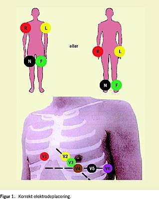 Elektroderne placeres som angivet på Figur 1 . Placering af prækordialelektroder kan undertiden volde besvær, særligt hos patienter med store mammae. Forkert placering kan medføre, at f.eks. ST-segment-elevationer reduceres eller øges. Ombytning af en eller flere ekstremitetselektroder ses overraskende hyppigt. Enkle tiltag og huskeregler kan hjælpe:
