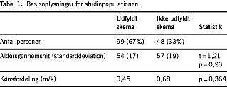 Svarprocenten var 67 (Tabel 1 ). I 22 tilfælde blev patienten udskrevet, før man kunne nå at udlevere spørgeskemaet, og 14 af disse besvarede ikke en skriftlig forespørgsel med frankeret svarkuvert. Alders- og kønssammensætningen for de patienter, der udfyldte skemaet, afveg ikke signifikant fra alders- og kønssammensætningen for dem, der ikke udfyldte skemaet.