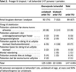 I Tabel 2 ses årsagerne til, at nogle af patienterne ikke indgik. I 12% af tilfældene lykkedes det enten ikke at aflevere skemaet under indlæggelsen eller at opnå, at patienten efterfølgende returnerede skemaet. Andre årsager til manglende udfyldning af skemaet var sprogvanskeligheder, eller at patienten efter behandlingen fortsat var for fysisk eller psykisk dårlig til at medvirke. Kun 4% ønskede udtrykkeligt ikke at deltage i undersøgelsen. Som det ses af Tabel 2, er der en overvægt af bilateralt behandlede patienter, som ikke magtede at indgå i undersøgelsen pga. fysiske eller psykiske forhold. Efter hvad patienterne selv oplyste i spørgeskemaet, blev 80% behandlet for depression, me ns ca. 5% blev behandlet for hhv. mani, skizofreni og skizoaffektiv lidelse. Fem procent kendte ikke indikationen for behandlingen.