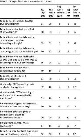 I Tabel 3 vises de spørgsmål, der blev stillet og den procentvise forekomst af hvert svar. Således mente 64%, at de i høj grad havde brug for ECT. Tilsvarende svarede 84%, at de i nogen grad eller i høj grad havde brug for behandlingen. 11% følte, at de kun i mindre grad eller slet ikke havde god effekt af den givne behandling. Alligevel var 94% alt i alt tilfredse med behandlingen, i det mindste i nogen grad, og omkring tre fjerdele ville vælge ECT igen, hvis de skulle komme i samme situation.
