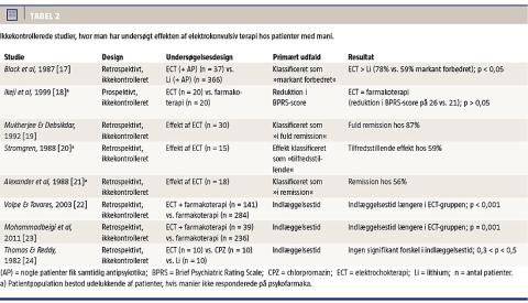 undersøgte ECT under forskellige forhold (f.eks. bitemporal vs. bifrontal eller med/uden samtidig valproatbehandling). Endelig fandt vi otte ikkekontrollerede undersøgelser, hvor man i nogle sammenlignede ECT med farmakoterapi. I det følgende angives sværhedsgraden af manien med den såkaldte Bech-Rafaelsen maniscore (MAS) [7].