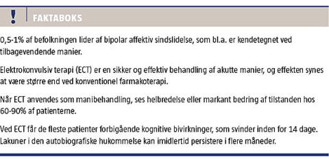 lithium og antipsykotika, og effekten synes at indsætte noget hurtigere. Endvidere fremgår det af litteraturen, at manier kræver færre ECT end svære depressioner. Man kan derfor spørge, hvorfor ECT ikke i højere grad anvendes til behandling af indlæggelseskrævende manier? Formentlig er en del af forklaringen, at det er svært at opnå informeret samtykke til ECT hos maniske patienter. Det kan tænkes, at stigmatisering af ECT og frygt for bivirkninger ved behandlingen også spiller ind. Vores litteraturgennemgang understøtter den indledningsvist nævnte anbefaling fra Dansk Psykiatrisk Selskab, og det er således væsentligt, at maniske patienter, der kan have gavn af ECT, også får denne behandling tilbudt som alternativ eller supplement til psykofarmakologisk behandling.