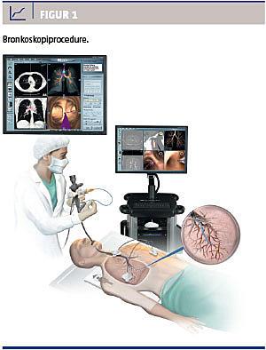 Det konventionelle fleksible bronkoskop har velkendte diagnostiske begrænsninger [1], hvorimod man med EMN-bronkoskopi får mulighed for at nå ud til perifere lungeinfiltrater [1-3]. Den første undersøgelse hos patienter blev gennemført i 2003, 13 patienter gennemgik EMN-bronkoskopi med undersøgelse af perifere lungeinfiltrater i størrelsen 1,5-5 cm i diameter. En endelig diagnose blev stillet hos ni (69%) af de 13 patienter. Der blev ikke rapporteret om nogen bivirkninger [4]. Yderligere en undersøgelse blev udført i Tyskland samme år, her opnåede man også en diagnose hos 69% af patienterne. I begge undersøgelser konkluderede man, at EMN-bronkoskopi er en sikker metode til endoskopisk at opnå biopsier fra perifere lungeinfiltrater. Der er siden da gennemført flere undersøgelser, inklusive af metodens anvendelighed til mediastinal udredning, da det også er muligt at udhente materiale fra mediastinale lymfeknuder [4]. Ud over at kombinere EMN-bronkoskopi med lymfeknudediagnostik har man søgt at kombinere med andre diagnostiske teknikker [5, 6]. Eberhardt et al publicerede i 2007 en prospektiv randomiseret undersøgelse til sammenligning af EMN-bronkoskopi, endoskopisk EBUS-undersøgelse ved tumor og en kombination af de to metoder. Endelig diagnostik blev opnået med en sensitivitet på 88% ved kombinationen af EMN og EBUS, hvilket var signifikant højere end ved EMN eller EBUS alene [7].