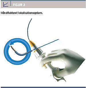 Navigation til tumoren sker via vejledning fra systemet (Figur 1). Den ekstra arbejdskanal, hvori sensoren er integreret, fremføres vejledt af skærmbilleder, som i realtid viser placering af arbejdskanalen i bronkierne i sagittal-, koronal- og aksialplaner. Ud over de tre planskærmbilleder vejledes navigationen af en markering af »målet« (Figur 1). Spidsen af arbejdskanalen/sensoren ledes i den rigtige retning, idet den kan bøjes i valgfri retning (Figur 2), alt efter vejledningen på skærmen, hvor relationen mellem den aktuelle retning og målet vises. Afstanden til tumorens centrum fremgår.