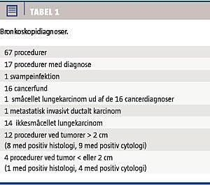 Der blev gennemført børstebiopsi i 66 procedurer (98%), bronkialskyl i 64 procedurer (96%) og tangbiopsi i 52 procedurer (78%). Hos en enkelt patient blev der gennemført nålebiopsi. Hos 16 af de 56 patienter medførte undersøgelsen en cancerdiagnose. Heraf ikkesmåcellet lungekarcinom-diagnose hos 14 patienter, småcellet lungekarcinom-diagnose hos en patient og metastatisk invasivt duktalt karcinom hos en patient (Tabel 1). Hos yderligere ti patienter blev der påvist malignitetssuspekte celler eller atypiske celler, hvilket indikerede behov for yderligere undersøgelser. Hos en patient blev en mistanke om Aspergillus-infektion endeligt bekræftet. Størrelsen af de undersøgte tumorer var i gennemsnit 2,2 cm; 36 (57%) var ≤ 2 cm i diameter, og 42 (64%) var placeret i venstre eller højre overlap.