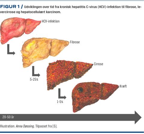 karcinom (HCC), der fører til leversvigt med ascites, bakteriel peritonitis, øsofagusvaricer med blødning og hepatisk encefalopati [4]. Udviklingen af HCV-infektion er afbildet i Figur 1. Den tidsmæssige udvikling og graden af leverskade varierer betydeligt og er afhængig af køn, komorbiditet og øvrige hepatotoksiske påvirkninger. Kronisk HCV-infektion påvirker den almene sundhedstilstand negativt både fysisk og mentalt og er forbundet med betydende ekstrahepatiske manifestationer; de hyppigste er type 2-diabetes mellitus (15%) og depression (25%) [6]. I tillæg til dette er kronisk HCV-infektion forbundet med øget risiko for at få kryoglobulinæmi, kronisk nyresygdom, lymfom, kutan porfyri, lichen planus, reumatoid artritis og kardiovaskulær sygdom [6]. Hvis HCV-infektionen eradikeres, bremses den progredierende fibrose. Såfremt der er udviklet cirrose, er der dog til trods for succesfuld behandling fortsat risiko for, at der sker udvikling af HCC [7].