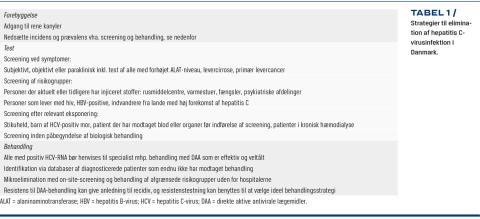 WHO’s forslag til global elimination af HCV består af tre tiltag: forebyggelse, test og behandling [12]. Eliminationsstrategierne er opsummerede i Tabel 1. I en nyligt publiceret oversigtsartikel, som er skrevet på vegne af det internationale netværk for hepatitis hos stofbrugere, fremhæves det, at de tre tiltag ikke kan stå alene; såvel vigtigheden af kommunikation både inden for sundhedssystemet og mellem sundhedssystemet og målgrupperne for eliminationstiltagene er vigtig [15]. Formålet er et personcentreret sundhedssystem med en koordineret eliminationsindsats. Det er derfor ikke kun et spørgsmål om at fastlægge en strategi for elimination, men også et spørgsmål om, hvorvidt vores sundhedssystem er denne opgave moden, således at der er tale om reel adgang til forebyggelse, test og behandling. En eliminationsstrategi i Danmark bør indbefatte både politikere, sundhedsaktører og borgere, særligt de afficerede risikopopulationer.