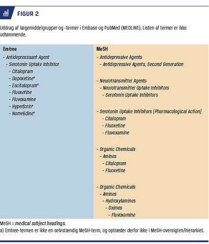 Antallet og specificiteten af emneord varierer også, idet Emtree indeholder > 70.000 termer [24], hvorimod PubMed (MEDLINE) indeholder knap 28.000 termer [25]. Omkring halvdelen af emneordene i Embase er lægemiddeltermer og kemiske termer, hvilket understreger det fokus, Embase har på farmakologisk litteratur [24]. Emtree synes at være mere overskueligt opbygget end MEDLINE, når det kommer til lægemiddelgrupper og -termer. I Figur 2 ses et eksempel på Emtree- og MeSH-opbygningen. I Embase i hierarkiet under Emtree-ter-