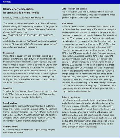 <li>Gupta JK, Sinha AS, Lumsden MA et al. Uterine artery embolization for symptomatic uterine fibroids. The Cochrane Database of Systematic Reviews 2006, Issue 1. Art. No.: CD005073. DOI: 10.1002/14651858.CD005073.</li>