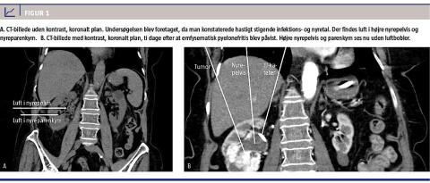 Antibiotisk behandling med cefuroxim blev iværksat på mistanke om pyelonefritis. Efter 12 timer steg leukocytniveauet til 29,8 × 109/l, CRP-niveauet til 115 mg/l og kreatininniveauet til 199 mikromol/l. Ved en akut foretaget CT af abdomen blev der påvist en højresidig obstruerende nyretumor på 60 × 40 mm med let hydronefrose, dilatation af den proksimale ureter samt EPN med luftbobler i nyrepelvis og