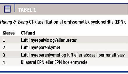 Emfysematisk pyelonefritis (EPN) er en alvorlig nekrotiserende infektion, som er karakteriseret ved bakteriel produktion af gas i nyreparenkymet, de fraførende urinveje og det perirenale væv [1-3]. Tilstanden er hyppigst forekommende hos kvinder og ses overvejende hos personer med diabetes. Det formodes, at den høje koncentration af glukose i nyrevævet i kombination med et kompromitteret immunforsvar og nedsat vævsperfusion skaber et gunstigt miljø for gasproducerende bakterier, hvoraf Escherichia coli den hyppigste [3]. Hos patienter uden diabetes kan EPN opstå som følge af obstruktion af urinvejene og kompromitteret blodforsyning i nyren som følge af neoplasier [1, 3, 4]. Vi beskriver et tilfælde af EPN hos en patient, som havde en nyretumor, men ikke diabetes.