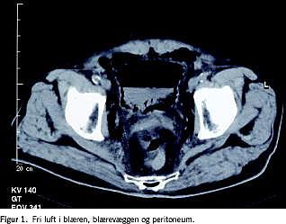 En 74-årig mand, der ikke tidligere havde været hospitaliseret, men havde haft type 2-diabetes, kronisk obstruktiv lungesygdom og forhøjet blodtryk gennem mange år, blev indlagt akut efter to uger varende, tiltagende abdominalsmerter. Patienten var metabolisk acidotisk, havde svært forhøjede infektionsparametre, samt blodsukker (B-glukose) på 20 mmol/l. Objektivt fandt man abdomen spændt, diffust ømt og med peritoneal reaktion. En akut computertomografi viste fri luft i blæren, blærevæggen og i peritoneum (Figur 1).