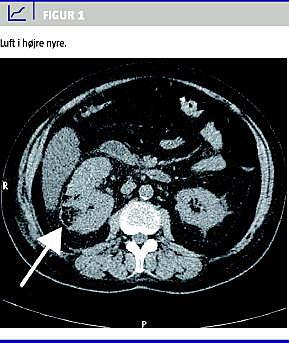 Objektivt: febrilia, sløret sensorium og smerter i abdomen lokaliseret til højre fossa. Paraklinisk: glukose 46 mikromol/l, leukocytter 15,5 × 109 /l, C-reaktivt protein (CRP) 7.248 mikromol/l, kreatinin 206 mikromol/l. Urinstiks: +blod, +ketoner, leukocyt- og nitritnegative. Patienten blev overflyttet til intensiv afdeling og behandlet for ketoacidose. CT af abdomen viste luft i højre nyres parenkym (Figur 1 ), luft i pelvis og i proksimale del af ureter. Ingen konkrementer eller hydronefrose.