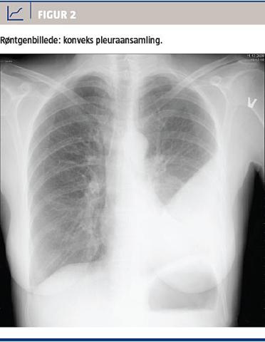intravenøst givet cefuroxim og metronidazol. En røntgenundersøgelse af thorax viste venstresidigt pleuraempyem (Figur 1), hvorfor der blev lagt UL-vejledt pleuradræn, hvorfra der blev udtaget sekret, der blev sendt til dyrkning og resistensbestemmelse. Ved mikroskopi af pleuravæsken sås der mange leukocytter og grampositive diplokokker, men væsken var dyrkningsnegativ. På mistanke om pneumokokempyem justeredes patientens antibiotiske behandling til penicillin. CT af thorax viste en pleural ansamling, der dækkede to tredjedele af venstre lungefelt. Ansamlingen var konsolideret og arrangeret i kamre. Han blev udskrevet på dag 18 til peroral antibiotisk behandling og ambulant kontrol. Der var positiv pneumokokurintest, og behandlingen blev afsluttet på dag 60, hvor han ikke havde haft sequelae eller genindlæggelser.