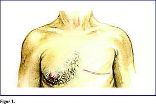 En 30-årig mand fik afgang af brunligt serøst sekret fra venstre papilla mammae og let ømhed i området. Han kontaktede egen læge, som valgte at se tiden an både ved første og anden henvendelse. Der var ingen palpabel tumor i området, ingen retraktion af papillen, ingen blødning eller hudforandring. Symptomet vedblev. Patienten skiftede t-shirt flere gange dagligt og valgte efterhånden at gå med plaster over papillen. Efter ca. seks måneder aftog sekretionen. Til gengæld opstod der en palpabel subareolær tumor, som straks medførte henvisning til mammacenteret på Organkirurgisk Afdeling på Vejle Sygehus. Tumoren blev excideret, og patologisvaret viste overraskende et 12 mm stort invasivt duktalt karcinom med malignitetsgrad 1. Ved efterfølgende mastektomi fandt man ingen spredning til fem sentinel nodes . Tumoren var østrogenreceptor- og progesteronreceptor-positiv.