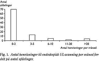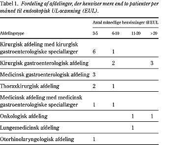 Fordelingen af, hvor mange patienter hver afdeling månedligt henviste til EUL, er vist i Fig. 1 . I Tabel 1 er anført afdelingstypen for de 24 afdelinger, der henviste mere end to patienter til undersøgelse per måned. Det ses, at over halvdelen af disse er forskellige typer af kirurgiske afdelinger. Blandt de responderende afdelinger er der otte, der anførte selv at udføre EUL. Sammenhængen mellem hvor der udførtes EUL og fornemmelsen af, hvor tilgængelig undersøgelsen var, er givet i Tabel 2 . Det ses, at 21 afdelinger (22%) havde problemer med at få udført det antal undersøgelser, der skønnedes behov for. Hvis man sammenligner, hvor der udførtes EUL (egen afdeling versus anden afdeling, eget sygehus versus andet sygehus, eget amt versus andet amt) med, om man fik udført det ønskede antal undersøgelser, ser man, at der var signifikant færre problemer med at få det ønskede antal undersøgelser, hvis EUL udførtes i eget amt (p=0,012). I Tabel 3 er angivet afdelingernes indikatio ner for henvisning af patienter til EUL samt afdelingens vurdering af, om der ville blive henvist flere patienter, hvis der var lettere adgang til EUL. Der er flest afdelinger, som henviste til EUL med henblik på stadie- og resektabilitetsvurdering af øvre gastrointestinale cancere eller med henblik på diffenrentialdiagnostik ved submukøse forandringer i mave-tarm-kanalen. Inden for alle de anførte indikationsområder ville afdelingerne henvise flere patienter, hvis der var lettere adgang til EUL.