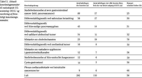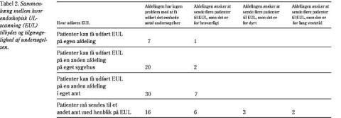 Med en svarprocent på over 80, og en sygehus- og afdelingsfordeling, der svarer til fordelingen blandt de adspurgte afdelinger, skønnes materialet at være repræsentativt. Vi fandt, at hver femte afdeling havde problemer med at få udført det ønskede antal undersøgelser, og at mere end hver tredje afdeling ville henvise flere patienter til EUL, hvis der i fremtiden var lettere adgang til undersøgelsen. Disse tal kan måske tillige tolkes som værende mindstetal, idet det er sandsynligt, at der blandt de afdelinger, der angav, at de ikke gjorde brug af EUL, findes nogle, som ville henvise patienter til undersøgelse, hvis der var bedre kendskab til indikationerne for EUL. Uafhængigt af dette forhold antyder tallene, at der må skaffes lettere adgang til at få udført EUL i Danmark. Det er især bemærkelsesværdigt, at man ville henvise flere patienter med henblik på vurdering af øvre gastrointestinale cancere, hvis der var lettere adgang til EUL, idet dette er den bedst evaluerede indikation for EUL (2). En lignende observation er gjort i en amerikansk undersøgelse, hvor netop tilgængelighed af EUL havde sammenhæng med, om patienter med esophaguscancer blev henvist til undersøgelse (6).