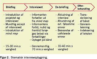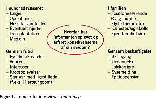 Undersøgelsen er baseret på interview og deltagerobserva- tion [8]. Interviewformen er semistruktureret og bygger på et mind map (Figur 1 ), som introducerer mulige temaer for interviewet. Figur 2 viser interviewopbygningen. Interview med i alt 11 informanter blev primært fortaget i deres hjem. Interviewdata er suppleret med deltagerobservation, som er en metode til at tage del i og observere menneskers sociale liv på deres præmisser [9]. Rent praktisk består deltagerobservationen i deltagelse i to arrangementer i patientforeningen Hjerteungdom (HU), som er en forening under Hjerteforeningen for personer over 18 år med medfødte hjertefejl. Det første arrangement foregik i et privat hjem, hvor medlemmer af HU diskuterede deres bekymringer i forhold til at være hjertesyg, og fungerede som et pilotstudium for undersøgelsen. Det andet arrangement forløb over en weekend, hvor medlemmer deltog i generalforsamlingen, foredrag, bowling og spisning. Formålet med deltagerobservationen var at observere den sociale interaktion mellem medlemmerne.