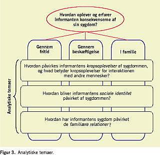 Interviewmaterialet består primært af for tællinger om familie, uddannelse/arbejde, sundhedsvæsen og fritid jf. Figur 1. Ved nøje gennemgang af de transskriberede interview blev det at være anderledes og afvigende fundet at være et gennemgående tema. Informanterne oplevede, at kropslige afvigelser og manglende fysiske formåen havde betydning for socialt samvær, hvilket uundgåeligt indvirkede på deres selvopfattelse. I analysen af informanternes selvopfattelse blev det antropologiske begreb social identitet inddraget. Social identitet handler om, hvordan man ser sig selv og forsøger at fremstille sig selv over for andre, og hvordan andre ser og behandler en [10]. Familien viste sig at have central betydning for informanternes sygdomssocialisering og dermed for deres gældende sygdomsforståelse. Analysens temaer er: kropsoplevelser, social identitet og familiære relationer jf. Figur 3 .