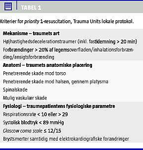 Traumepatienter inddeles i grupper afhængigt af sværhedsgraden af deres skader [3]. Priority 1 er de patienter, som er i akut livsfare, og som skal resusciteres med det samme (Tabel 1 ). Priority 2-patienter kræver akut lægebehandling, men er ikke i livsfare, det kan f.eks. dreje sig om en femurfraktur. Priority 3-patienter er the walking wounded og priority 4 er de døde.
