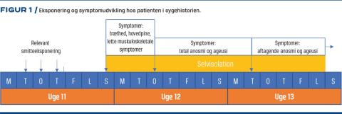En ung mand, der var i 20’erne, tidligere sund og rask og ikke tog nogen medicin til dagligt, havde i uge 11 relevant smitteeksponering både privat og som sundhedsmedarbejder (Figur 1). Han havde haft nær kontakt med en bekendt, der dagen efter blev syg med høj feber. Denne person blev ikke testet for SARS-CoV-2. Han så i sit arbejde som sundhedsmedarbejder patienter med symptomer på ØLI, bl.a. patienter med rejseanamnese til de daværende SARS-CoV-2-relevante lande (Kina, Singapore, Hongkong, Japan, Iran og Norditalien). Efter 3-5 dage begyndte han at få symptomer og gik i selvvalgt karantæne. Symptomerne bestod udelukkende af hovedpine, træthed og let muskuloskeletal ømhed. Tilstanden varede i tre dage, hvorefter også sygdomsfølelsen forsvandt. Herefter oplevede han total anosmi og ageusi som eneste symptom. Han kunne spise rå hvidløg, chili og ingefær uden at smage noget – ikke engang den brændende fornemmelse var bevaret. Dette varede ved i seks dage, hvorefter det gradvist aftog.