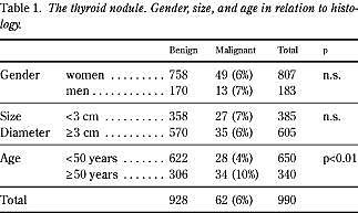 Der fandtes ingen øget hyppighed af maligne forandringer i en nodulus med tiltagende størrelse. 44% af de maligne knuder var mindre end 3 cm i diameter. Maligne knuder forekom signifikant hyppigere hos ældre patienter (p < 0,01), henholdsvis 4% og 10% hos patienter under og over 50 år (Tabel 1).