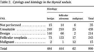I 214 tilfælde viste FNA benigne forhold, to (1%) af disse patienter havde karcinom og 66 follikulært adenom. I 243 tilfælde viste FNA follikulær neoplasi eller fremkaldte mistanke herom. I denne gruppe fandtes 17 (7%) karcinomer og 153 adenomer, mens 73 havde kolloid knude og/eller cyste. I 15 tilfælde viste FNA malign tumor, to af disse havde en benign knude, en havde et follikulært adenom og 12 (50%) en malign tumor. Forekomsten af malign tumor var 5% (25/483) blandt patienter med uegnet FNA, hvilket ikke er forskelligt fra gruppen med egnet FNA (7%: 31/472).