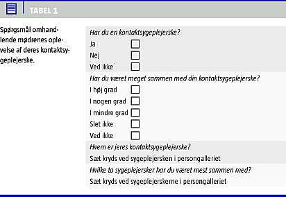 Derudover var der 13 spørgsmål om, hvordan mødrene vurderede plejen. De 11 spørgsmål, der var relevante for undersøgelsen, er medtaget i dette studie. Spørgsmålene blev besvaret på en firepunktsskala fra »I høj grad« til »Slet ikke«. Endelig var der fire spørgsmål, som omhandlede mødrenes oplevelse af kontaktsygeplejerskeordningen (Tabel 1 ), samt fire spørgsmål om generelle forhold som f.eks. indlæggelsestid, og om det var mødrenes første barn.