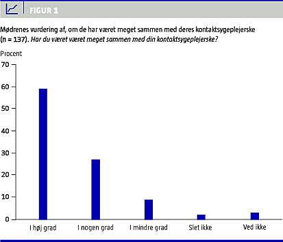 Figur 1 viser, at 87% (119/137) oplevede, at de i høj grad eller nogen grad havde været meget sammen med deres kontaktsygeplejerske. Når mødrene blev bedt om at udpege de to personer, de havde været mest sammen med, så var den ene lig med den, de havde angivet som kontaktsygeplejerske i 73% (85/117) af tilfældene.
