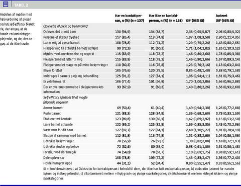 Resultater: I alt 300 mødre (81%) besvarede spørgeskemaet. Af de mødre, der oplevede at have en kontaktsygeplejerske, var der en større andel med en høj vurdering af plejen sammenlignet med de mødre, der ikke havde haft denne oplevelse (justeret oddsratio (OR) > 1 for 10/11 spørgsmål). Spørgsmålene »Personalet skaber tryghed« og »Personalet hjælper mig til at forstå barnets adfærd« var statistisk signifikante. Tilsvarende tendenser var gældende for 7/11 self-efficacy -spørgsmål. Ingen af disse var dog statistisk signifikante.