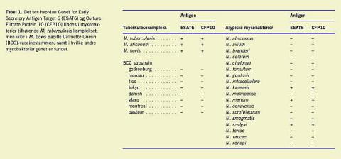 På Statens Serum Institut har man længe arbejdet på at udvikle en forbedret og specifik diagnostisk test for tuberkulose [1]. En række proteiner fra M. tuberculosis er blevet screenet, og resultatet er, at man har identificeret og karakteriseret to M. tuberculosis -specifikke antigener, Early Secretory Antigen Target 6 (ESAT6) og Culture Filtrate Protein 10 (CFP10), som genkendes hyppigt af tuberkulosepatienter. Disse antigener er helt unikke ved deres specificitet; genet for ESAT6 og CFP10 findes kun i M. tuberculosis -komplekset og ganske få andre mykobakterier, men ikke i M. bovis -BCG-vaccinestammen